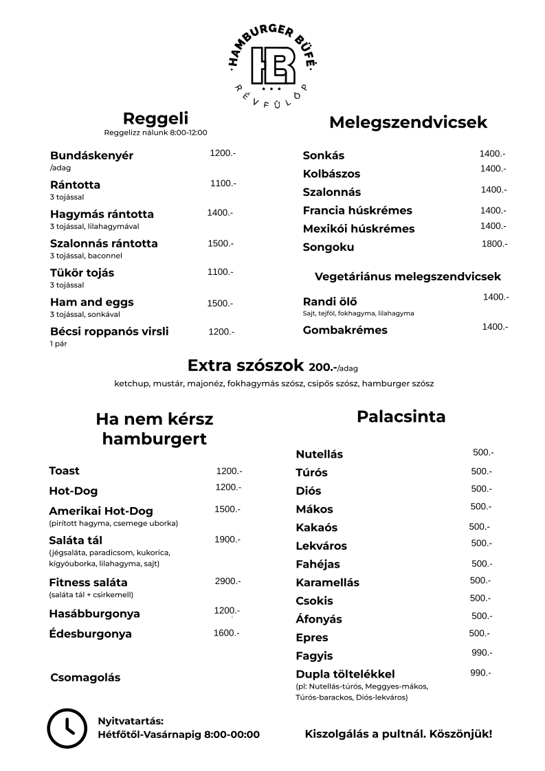 “ A legjobb smashburger ever!!! Szuper a fagyi is! Évek óta járunk vissza. Csodás minden étel és a kiszolgálás is. Szívét-lelkét beleadja a csapat! Nagyon ajánlom!!! ”